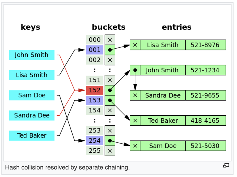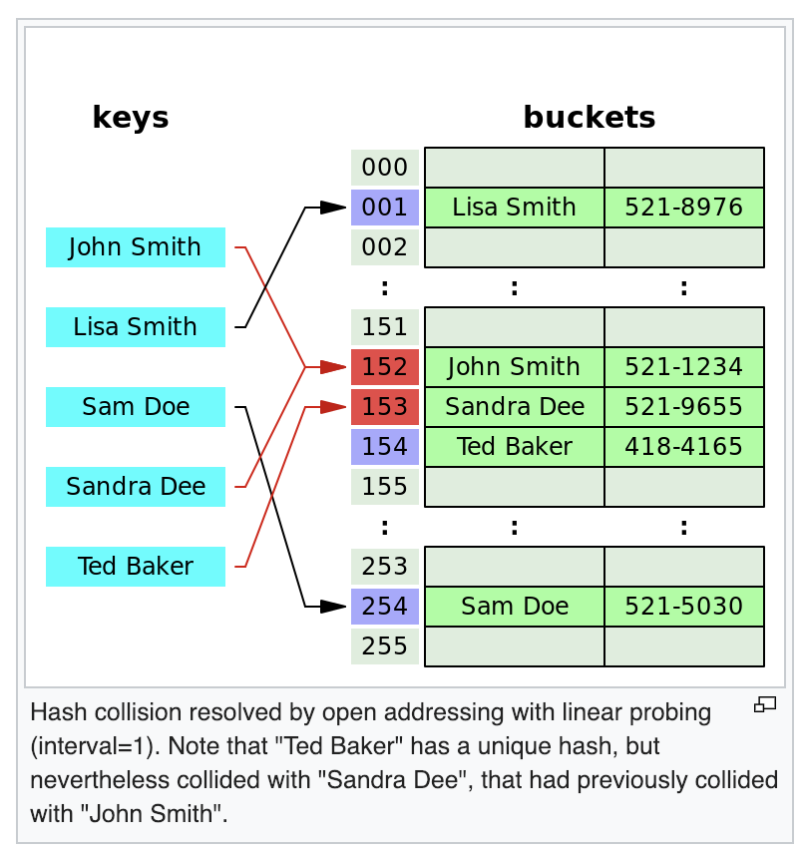 위 이미지에서는 John Smith와 Sandra Dee의 해시값이 중복이다.