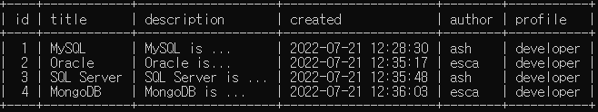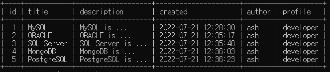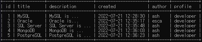VALUES('MySQL', 'MySQL is...', NOW(), 'ash', 'developer');