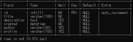 해당 table의 작성할 column 이름을 먼저 나열하고, VALUES()를 통해 차례로 값을 넣어준다. created의 경우는 NOW() 함수를 통해 현재시각을 반영한다. 참고로 id는 auto_increment를 통해 자동으로 중복되지않게 부여하기떄문에 적지 않는다.