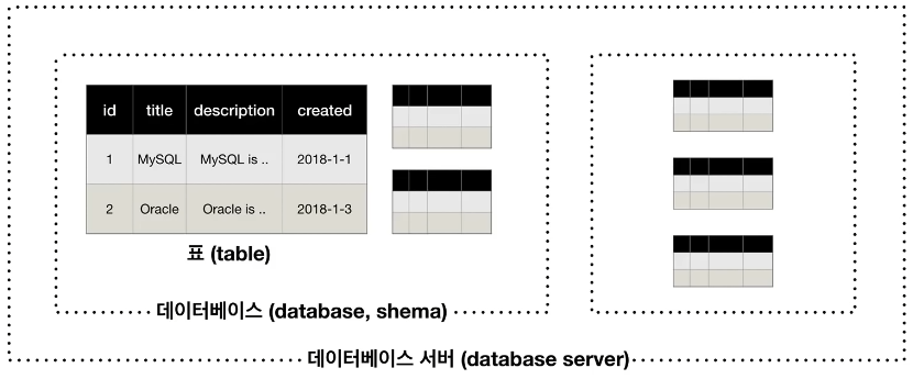 데이터베이스(database, schema) : 표들을 grouping한 집합