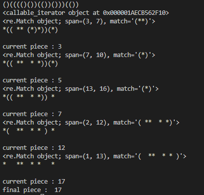 # iterator지만 list로 표현하자면 ['(**)', '(*)', '(*)'] 형식으로 저장되어있음